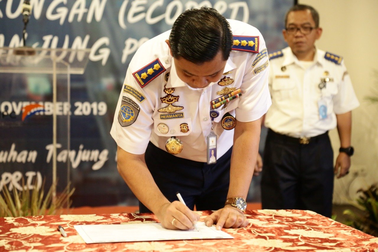 Kepala Kantor Otoritas Pelabuhan Utama Tanjung Priok, Capt Hermanta saat memberikan sambutan pada acara deklarasi penerapan konsep pelabuhan berwawasan lingkungan (ecoport) di Museum Maritim Indonesia Tanjung Priok, Rabu (20/11/2019) mengatakan melalui acara deklarasi ini, saya menekankan bawa penerapan konsep ecoport di Pelabuhan Tanjung Priok merupakan salah satu upaya perlindungan terhadap lingkungan. Seperti penggunaan bahan ramah lingkungan, pengurangan limbah (sampah), konservasi energi, dan antisipasi perubahan iklim melalui penggunaan energi.