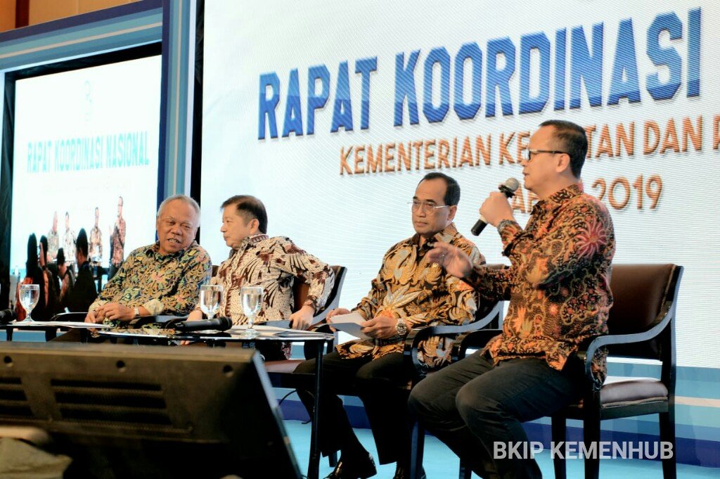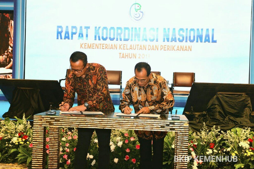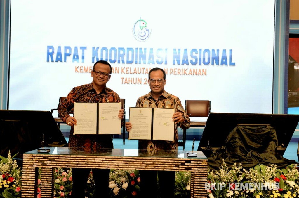 Menteri Perhubungan Budi Karya Sumadi dan Menteri Kelautan dan Perikanan (KKP) Edhy Prabowo melakukan Penandatanganan Kesepakatan Bersama tentang Sinergitas Pelaksanaan Pelayanan Publik di bidang kelautan perikanan pada Rapat Koordinasi Nasional Kelautan Perikanan di Hotel Borobudur, Jakarta, Rabu (4/12/2019).