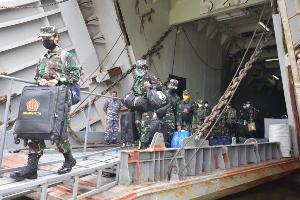 Satya Wira Jala Dharma. Kapal perang KRI Teluk Bentuni 520 membawa prajurit dari tenaga kesehatan yang baru, selesai menjalani pendidikan di Komando Pendidikan dan Latihan TNI AL (Kodiklatal) Surabaya. Kapal perang tersebut tiba di dermaga Kolinlamil, Tanjung Priok – Jakarta Utara,Selasa(21/4/2020).“KRI Teluk Bintuni 520 sandar di Dermaga Kolinlamil untuk debarkasi 46 perwira kesehatan (Dokter dan para medis) dan 40 bintara kesehatan yang akan diperbantukan di RS Darurat Wisma Atlet Kemayoran Jakarta Pusat, Rumah Sakait TNI AL Mintoharjo dan Rumah Sakit Corona Pulau Galang Kepulauan Riau. Untuk mendukung Satgas Covid-19,”demikian disampaikan Panglima Kolinlamil Laksda TNI Ahmadi Heri Purwono, S.E., M.M. diruang kerjanya, Selasa (21/4/2020).