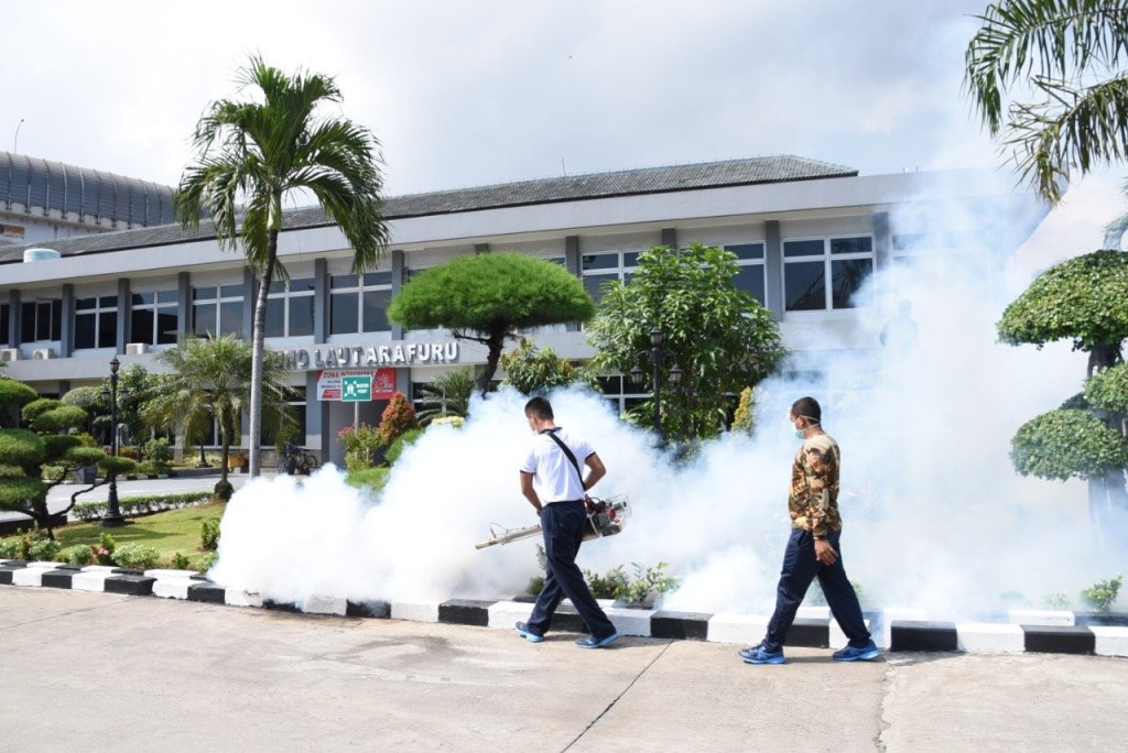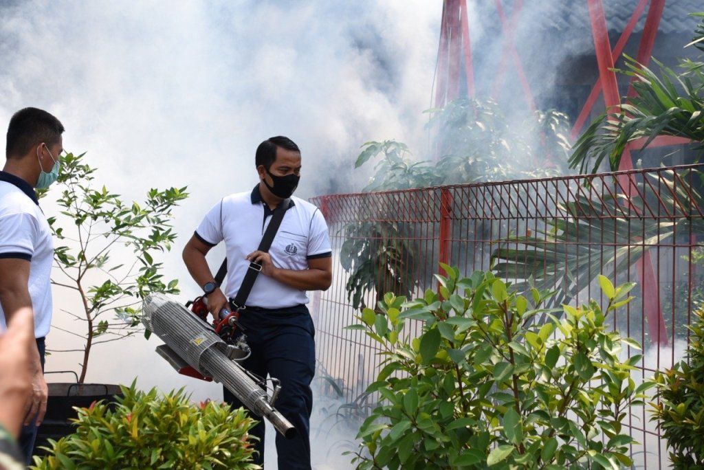 Memasuki pancaroba musim hujan ke musim panas, Demam Berdarah merupakan penyakit yang harus diwaspadai. Untuk mengantisipasi hal tersebut, petugas Dinas Kesehatan Komando Lintas Laut Militer (Kolinlamil) melakukan pengasapan (fogging), di Mako Kolinlamil, Tanjung Priok, Jakarta Utara, Jumat (24/4/2020).