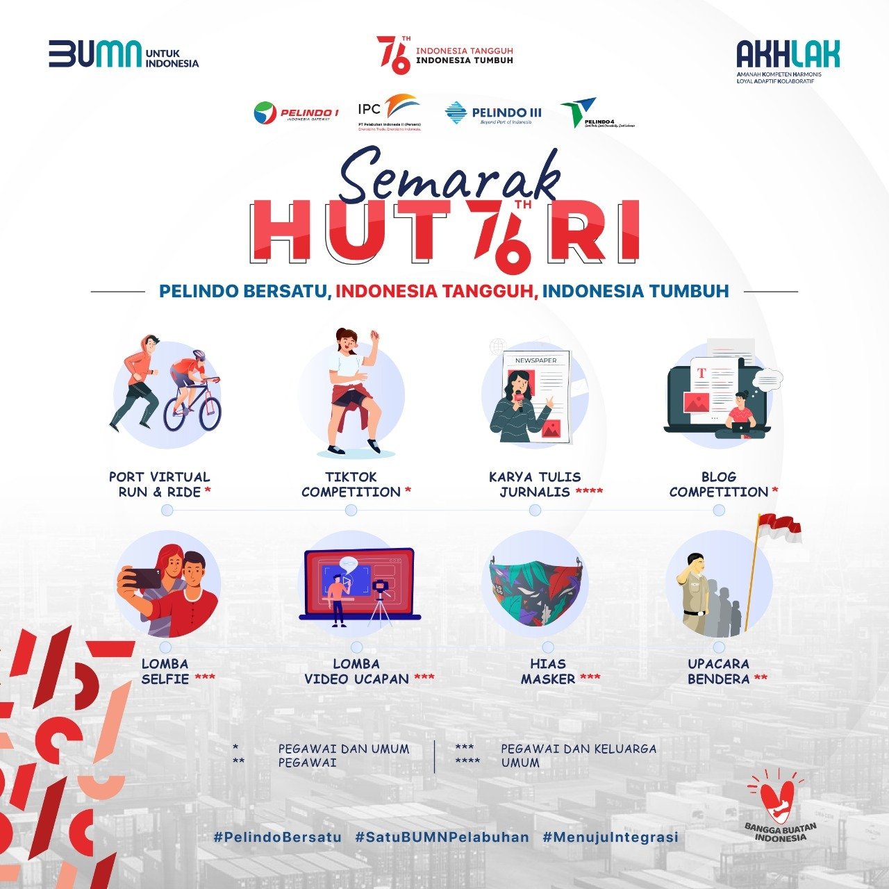 Dalam rangka memeriahkan Hari Ulang Tahun ( HUT) Kemerdekaan RI ke-76 tahun 2021, PT Pelabuhan Indonesia (Persero) I, II, III dan IV akan menggelar berbagai kegiatan lomba yang dapat diikuti oleh pegawai, keluarga pegawai dan masyarakat umum.