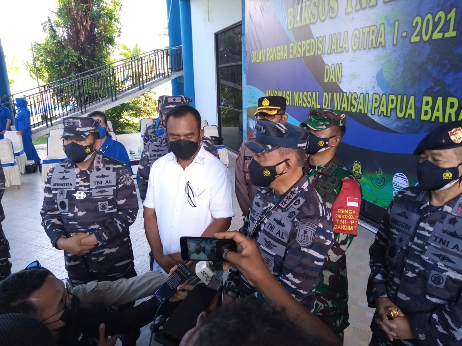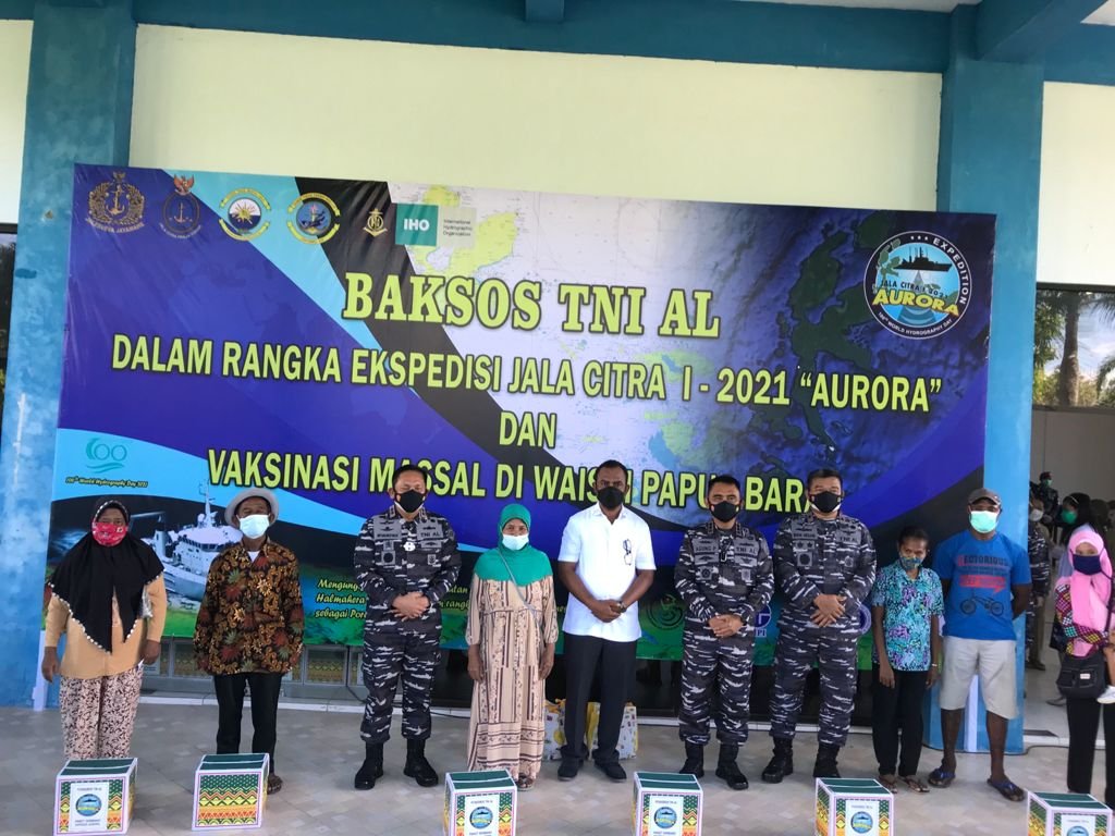 Dalam rangka Ekspedisi Jala Citra I “Aurora”, TNI Angkatan Laut menggelar Serbuan vaksinasi massal Covid-19 dan Bakti Sosial (Baksos) bagi masyarakat Maritim Waisai, Kabupaten Raja Ampat, Papua Barat, Selasa (24/8/2021).