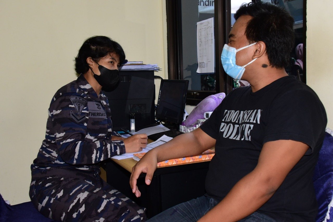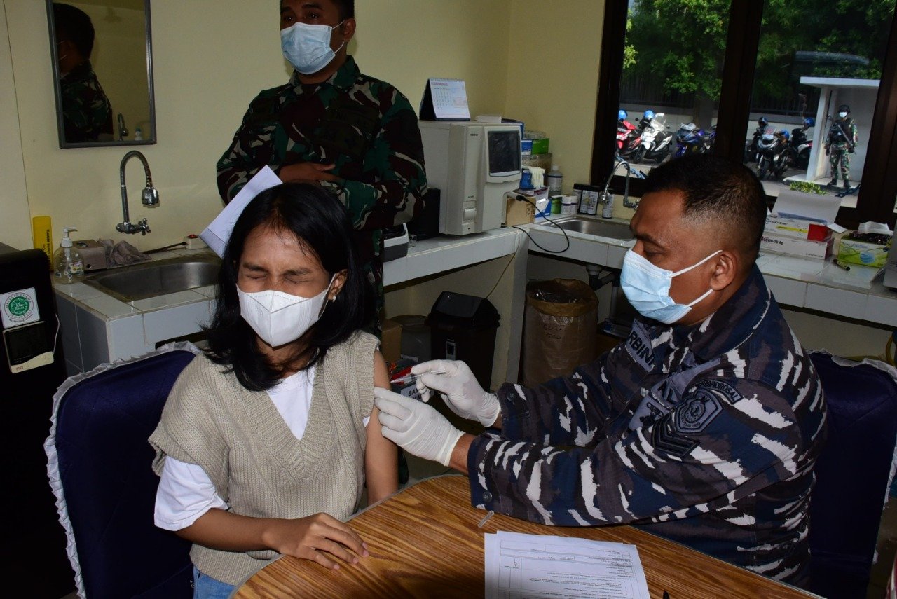Dinas Kesehatan Pusat Hidro-Oseanografi TNI Angkatan Laut (Diskes Pushidrosal) menggelar kembali serbuan vaksinasi rutin yang dilaksanakan di ruang Diskes Pushdirosal, Jl. Pantai Kuta V/1, Ancol Timur, Jakarta Utara. Senin (30/8/2021).
