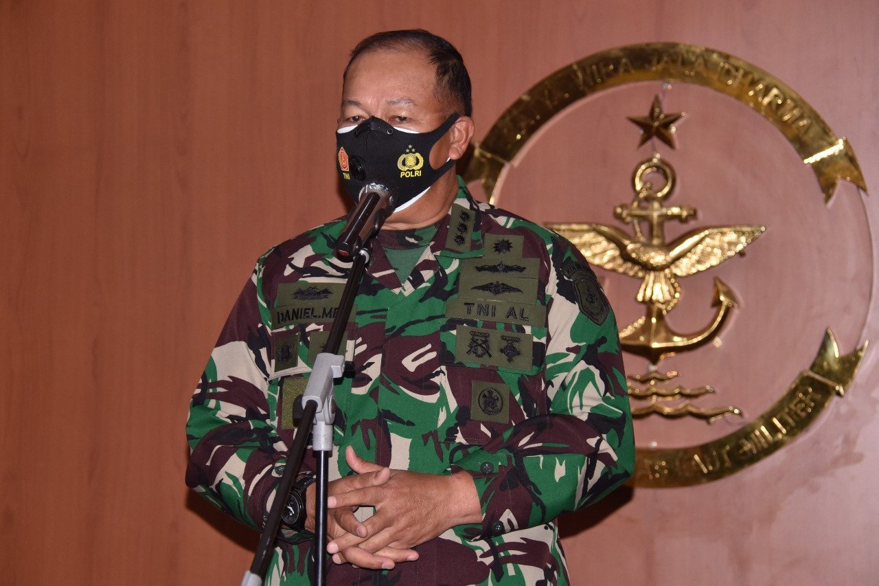 Satya Wira Jala Dharma. Panglima Komando Lintas Laut Militer (Kolinlamil) Laksma TNI Erwin S Aldedharma memimpin penyerahan jabatan Asisten Potensi Maritim (Aspotmar) di Mako Kolinlamil, Tanjung Priok, Jakarta Utara, Rabu (1/9/2021).