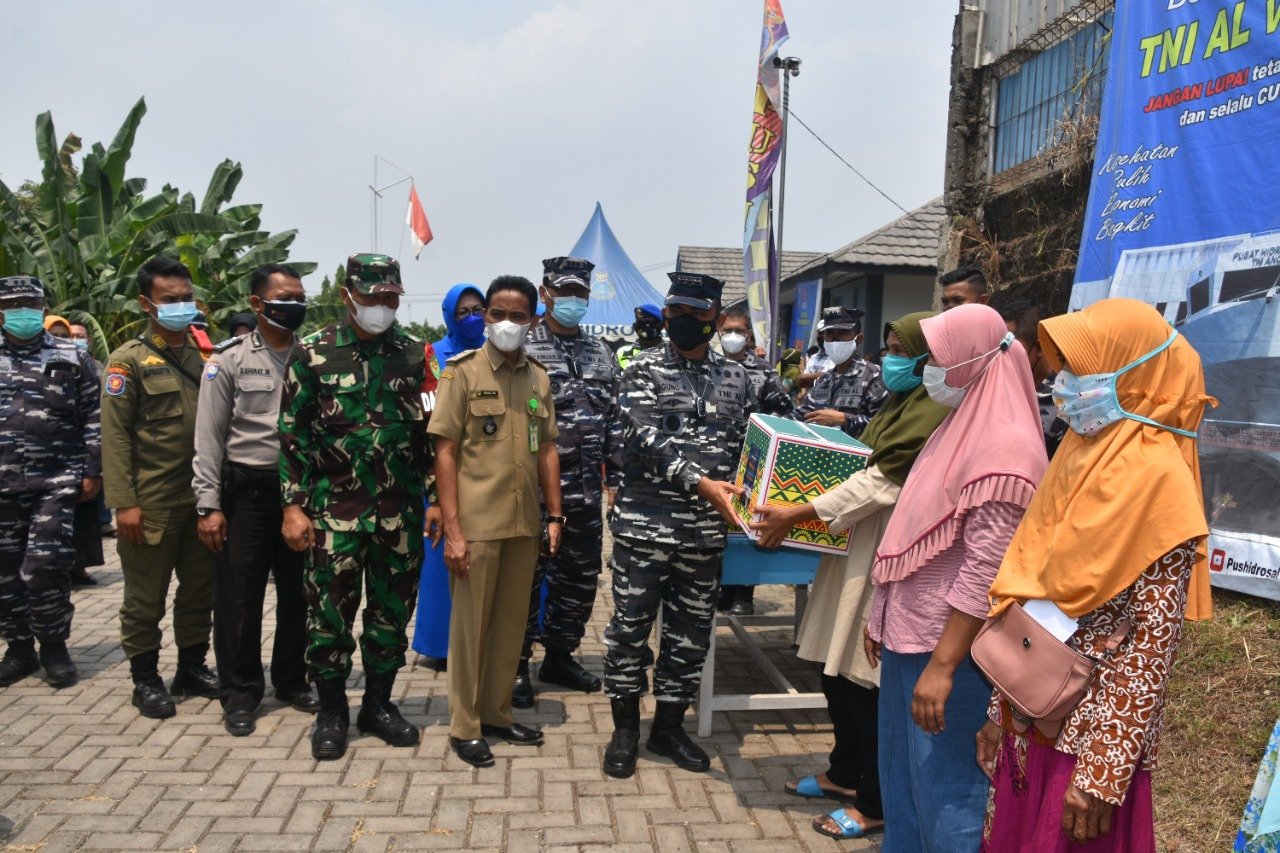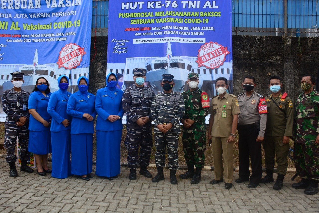 Dalam rangka memperingati HUT ke-76 TNI Angkatan Laut, Pusat Hidro-Oseanografi TNI AL (Pushidrosal) menggelar kegiatan bakti sosial serbuan vaksinasi Covid-19 dan pembagian paket sembako bagi masyarakat Desa Pasir Angin, Cileungsi – Bogor, Selasa (7/9/2021).