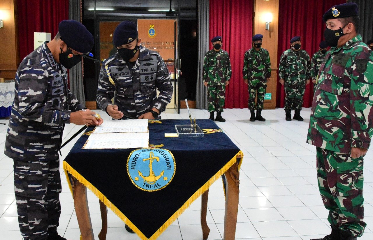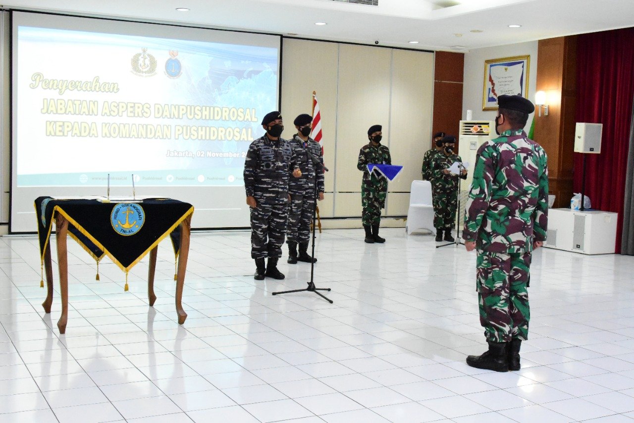 Komandan Pusat Hidro-Oseanografi TNI Angkatan Laut (Danpushidrosal) Laksamana Madya TNI Dr. Agung Prasetiawan , M.A.P. memimpin upacara Penyerahan jabatan Asisten Personel (Aspers) Danpushidrosal di Lounge Room Perwira Mako Pushidrosal, Jalan Pantai Kuta V/I, Ancol Timur – Jakarta Utara. Selasa (2/11/2021).