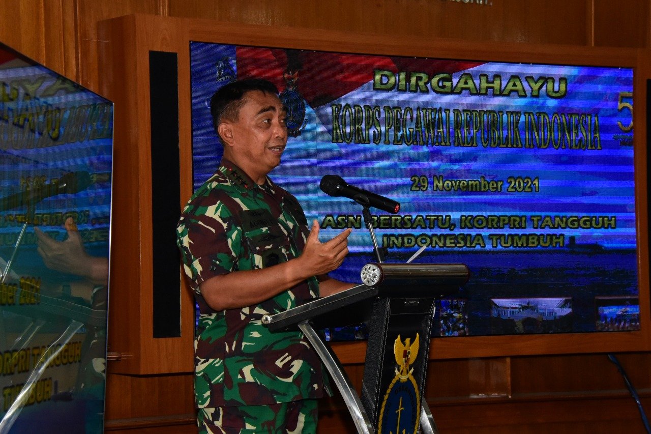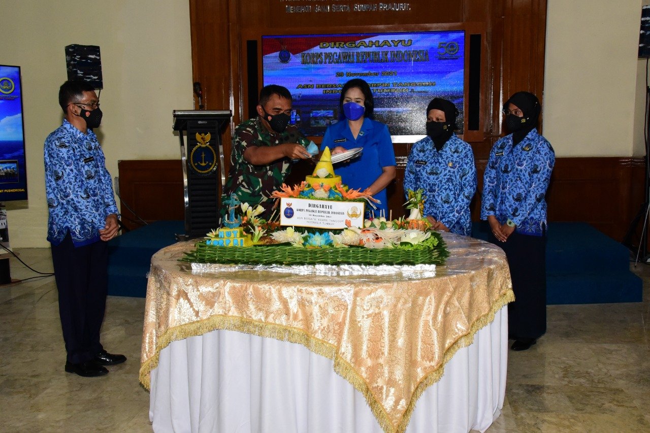 Komandan Pusat Hidro-Oseanografi TNI Angkatan laut (Danpushidrosal) Laksamana Madya TNI Dr. Agung Prasetiawan, M.A.P., menghadiri acara syukuran Hari Ulang Tahun (HUT) ke-50 Korps Pegawai Republik Indonesia (Korpri) , di Lobby Mako Pushidrosal, Jalan Pantai Kuta V/I, Jakarta Utara. Senin (29/11/2021).