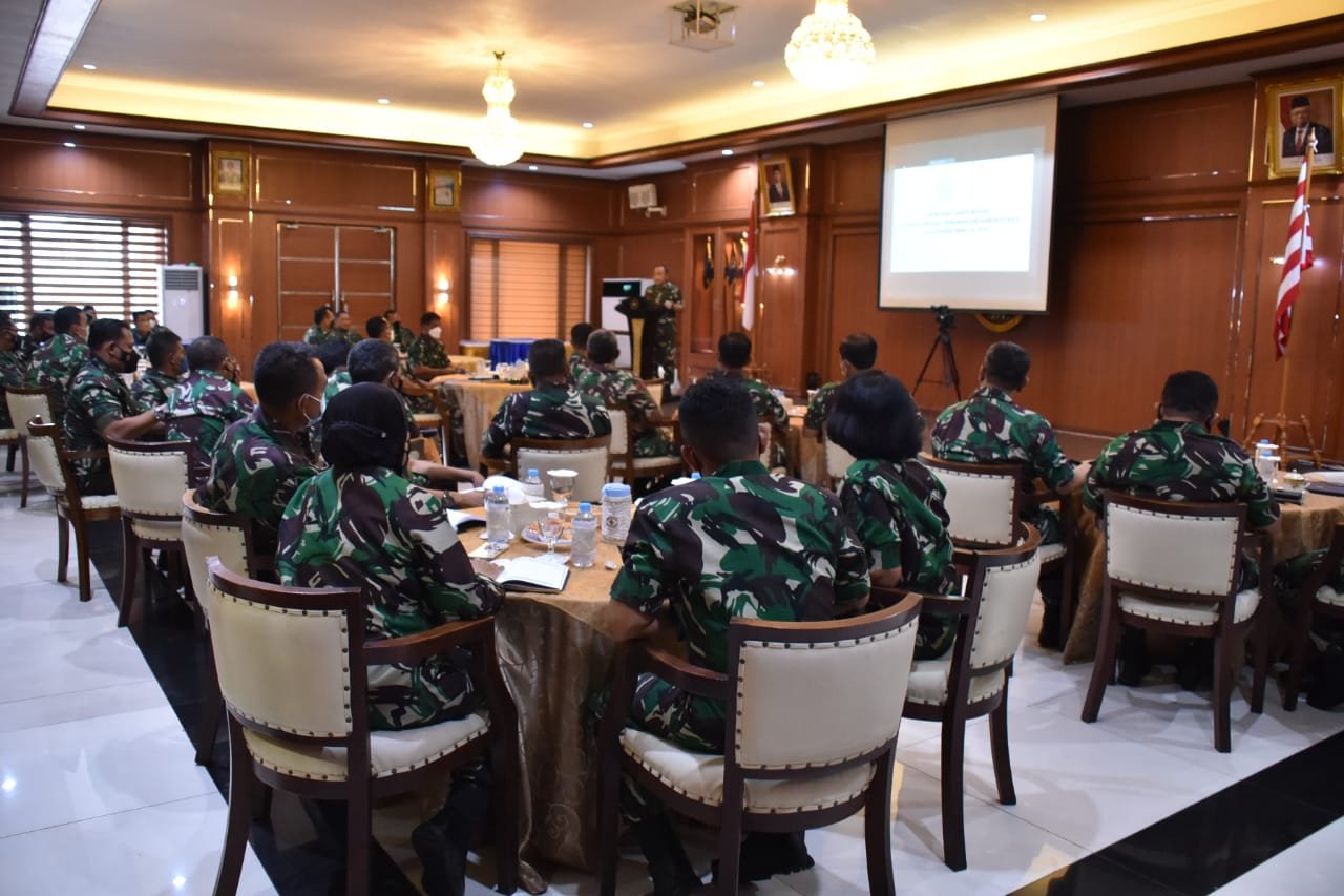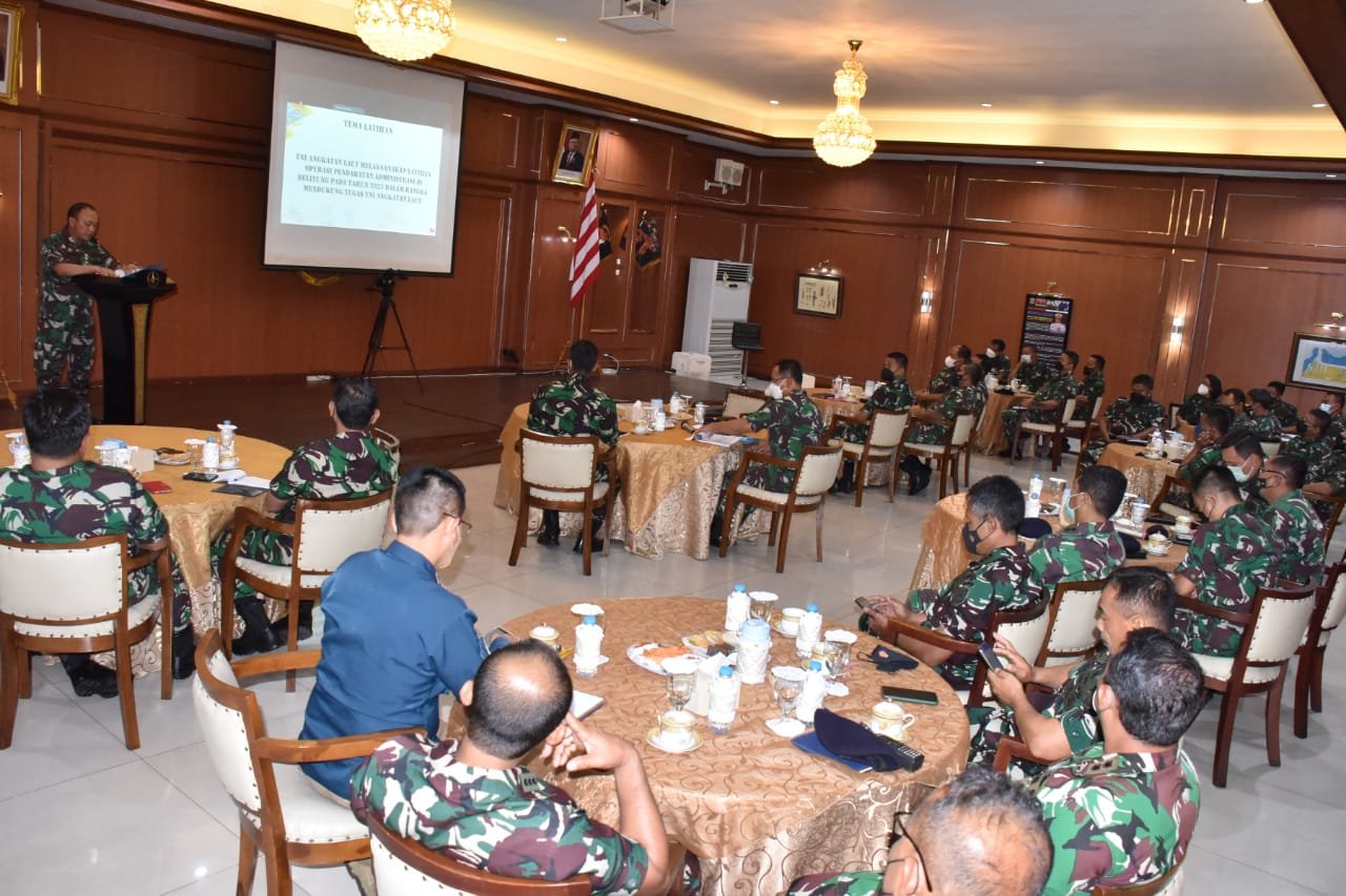 Satya Wira Jala Dharma. Asisten Operasi Komando Lintas Laut Militer (Asops Pangkolinlamil) Kolonel Laut (P) Nanan Isnandar memaparkan rencana Latihan Operasi Pendaratan Administrasi 2021, di Gedung Laut Nusantara, Mako Kolinlamil, Tanjung Priok, Jakarta Utara, Selasa (7/12/2021).