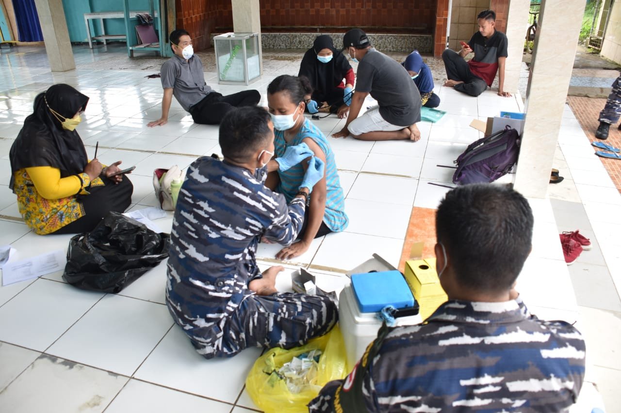 Satya Wira Jala Dharma. Vaksinator Komando Lintas Laut Militer (Kolinlamil) kembali menyuntikan dosis vaksin dalam Serbuan Vaksinasi jelang akhir tahun 2021 yang digelar di dua lokasi sekaligus Cilamaya, Kabupaten Karawang dan Tarumajaya, Kabupaten Bekasi, Kamis (9/12/2021).