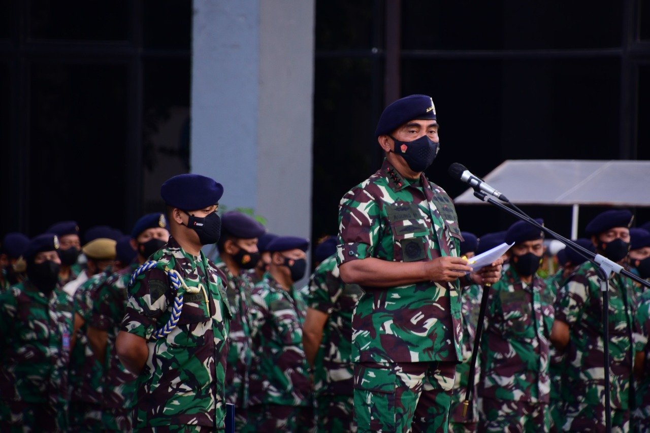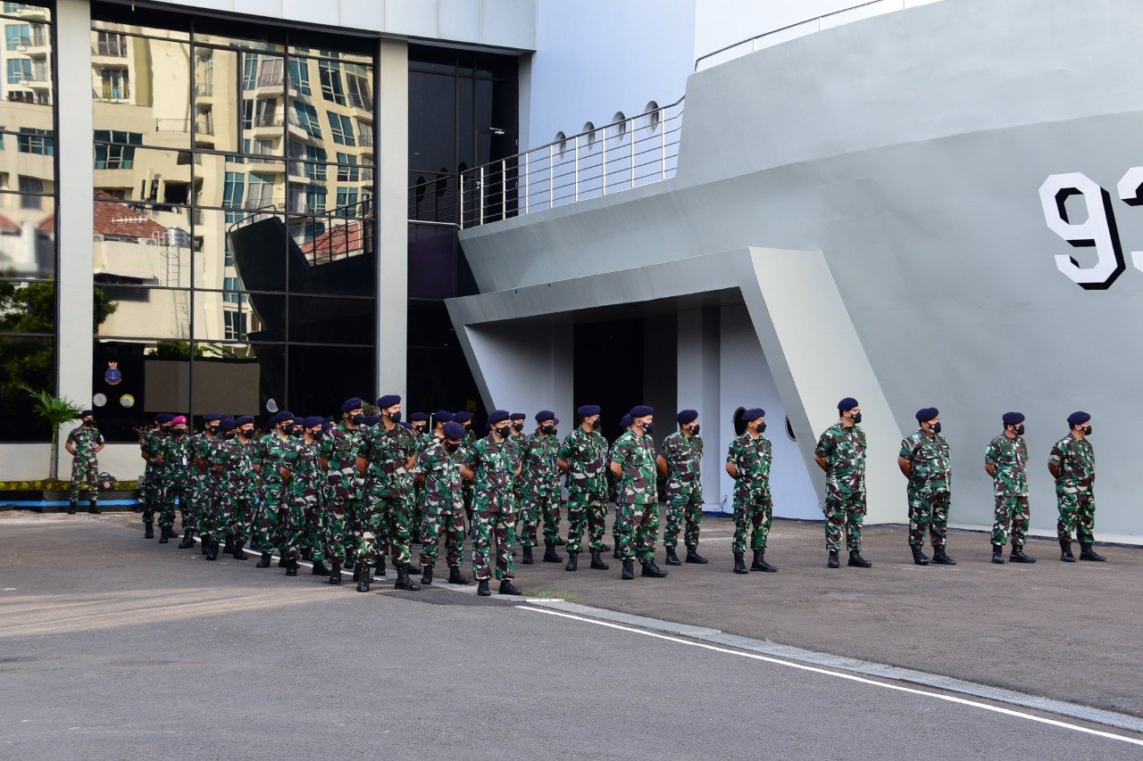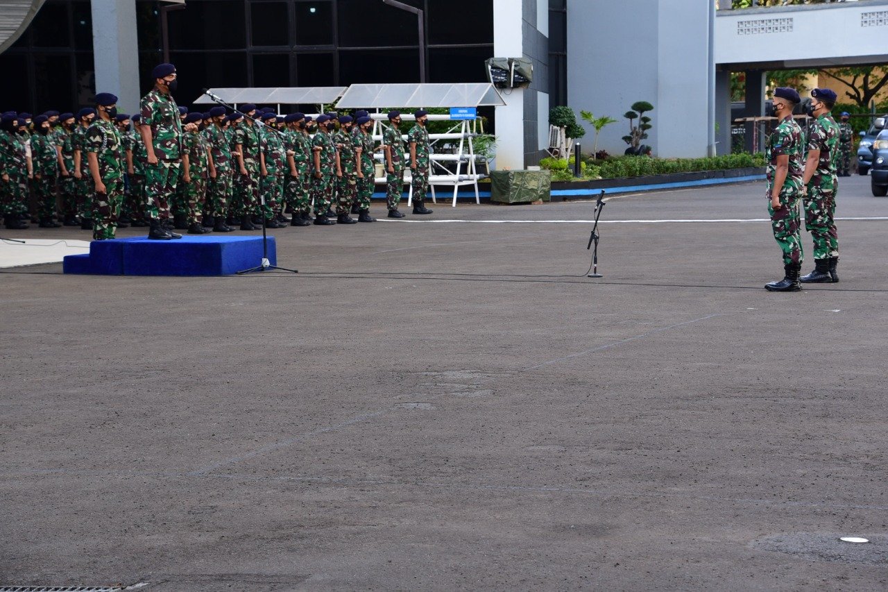 Komandan Pusat Hidro-Oseanografi TNI Angkatan Laut (Danpushidrosal) Laksamana Madya TNI Dr. Agung Prasetiawan, M.A.P., memimpin apel khusus yang diikuti oleh seluruh anggota Militer dan PNS di Mako Pushidrosal, Jalan Pantai Kuta V/I, Ancol Timur, Jakarta Utara, hari ini, Senin (3/01/2022).