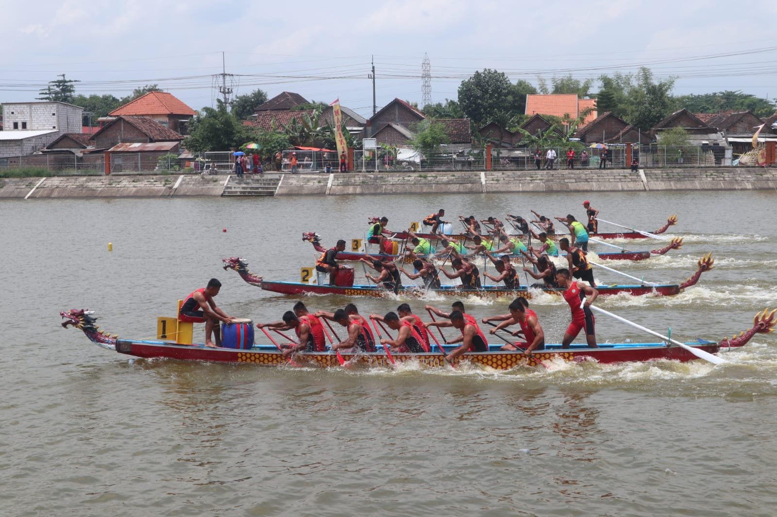 Tampak di kejauhan para atlet dayung Satlinlamil 2 mengayuh dayungnya dengan penuh semangat sesuai dengan irama yang dimainkan oleh penggebuk drum. Sampai akhirnya perahu naga tim Satlinlamil 2 mencapai garis finish.