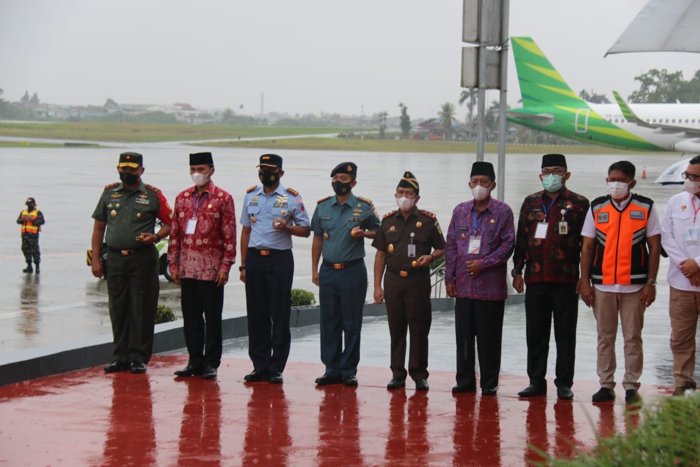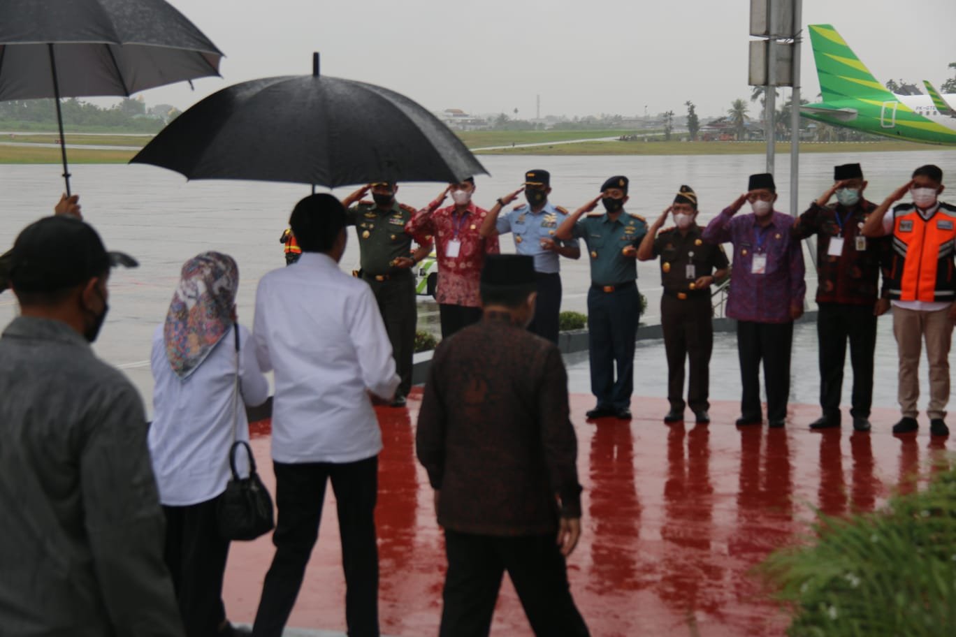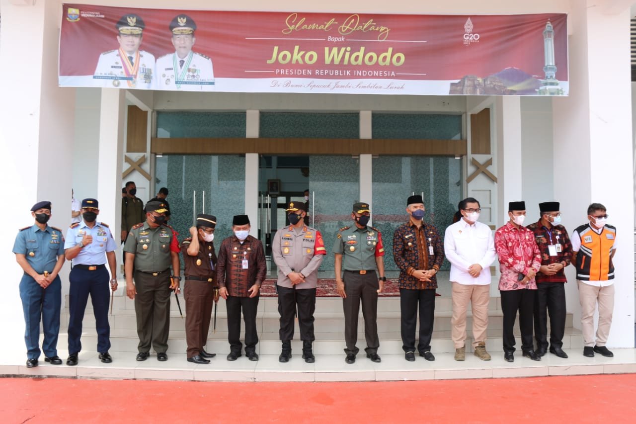 Komandan Pangkalan TNI Angkatan Laut Palembang Kolonel Laut (P) Widyo Sasongko bersama Forum Koordinasi Pimpinan Daerah (FKPD) Provinsi Jambi menyambut kedatangan Presiden Joko Widodo beserta Ibu Hj. Iriana Widodo beserta Rombongan di VIP Room Bandar Udara Sultan Thaha Saifuddin, Kota Jambi, Kamis (7/4/2022).