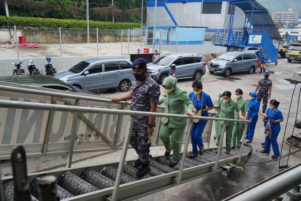 KRI Teluk Bintuni-520 yang tengah sandar di pelabuhan Jayapura, Papua dalam rangka mendukung Serpas Yonif Raider 142/Ksatria Jaya menerima kunjungan kehormatan Ketua Dharma Pertiwi Daerah H Ny. Erni Teguh Muji Angkasa di dampingi Wakil Ketua Ny. Merry Feryanto P. Marpaung dari organisasi Jalasenastri beserta pengurus Dharma Pertiwi Daerah H, Sabtu (9/4/2022). Kunjungan yang dilaksanakan tersebut tetap mengedepankan protokol kesehatan.