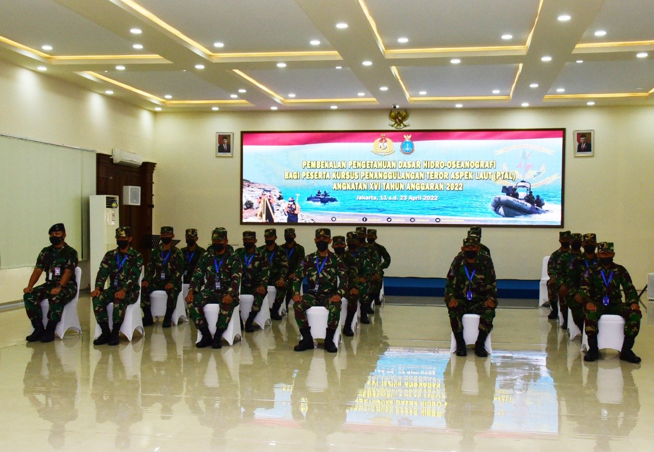 Peserta Kursus Penanggulangan Teror Aspek Laut (PTAL) Angkatan XVI TA 2022, menerima bekal pengetahuan dasar Hidro-oseangrafi (Hidros) di Gedung Serbaguna Markas Komando Pusat Hidro-Oseanografi TNI AL (Pushidrosal),di Jalan Pantai Kuta V/I, Ancol Timur, Jakarta Utara. Senin (11/4/2022).