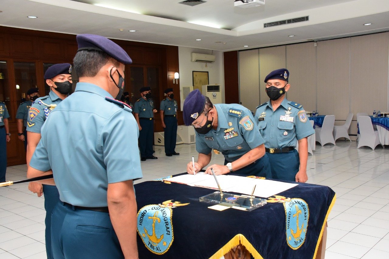 Komandan Pusat Hidro-Oseanografi TNI Angkatan Laut (Danpushidrosal) Laksamana Madya TNI Nurhidayat memimpin serah terima jabatan Inspektur Pushidrosal di Lounge Room Perwira Pushidrosal, Jalan Pantai Kuta V/I, Ancol Timur – Jakarta Utara. Rabu (11/5/2022).