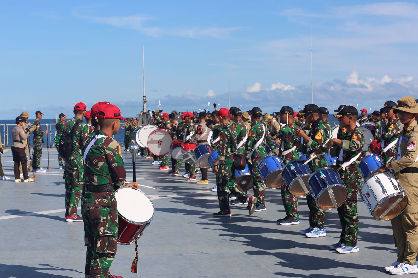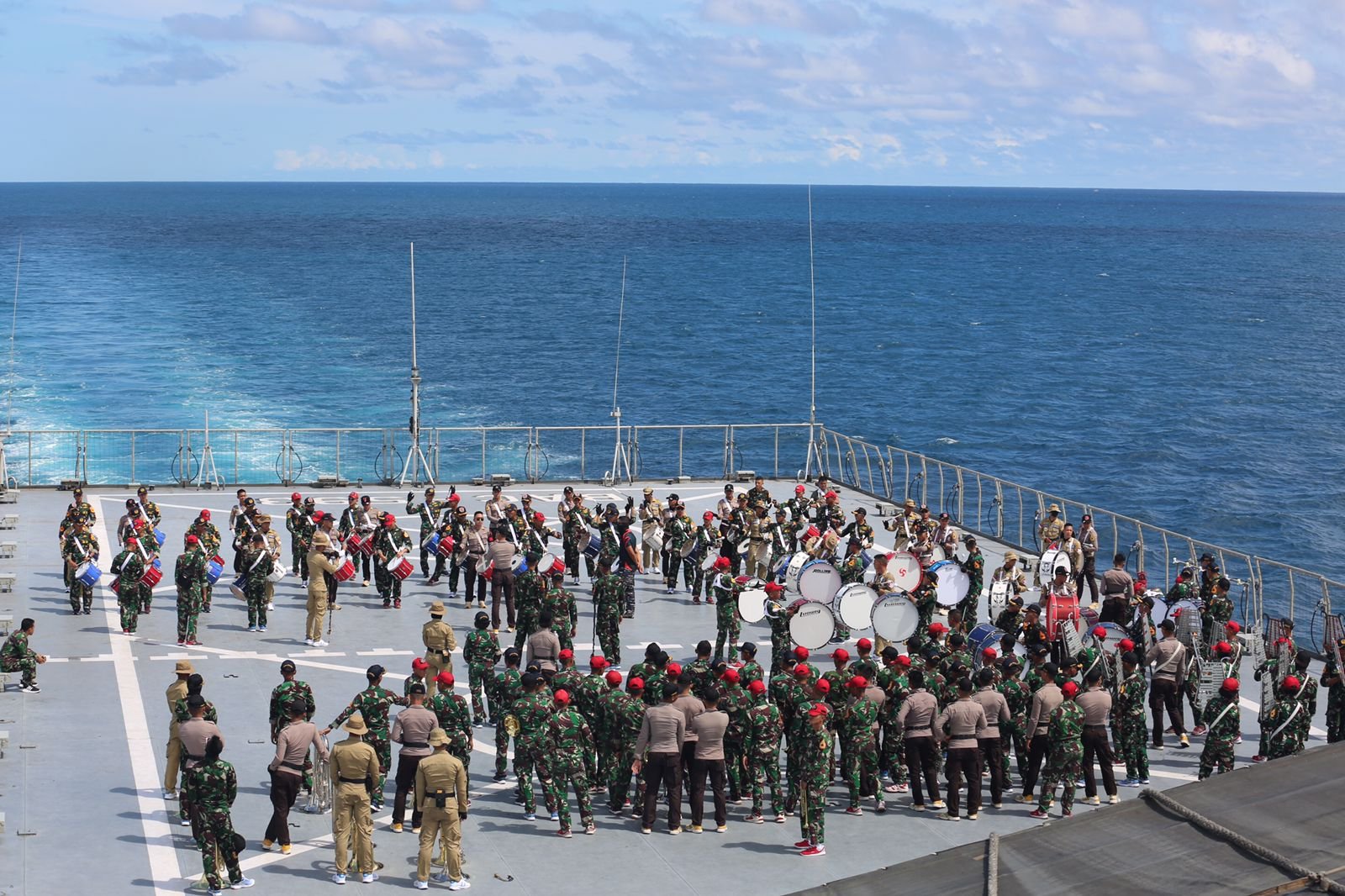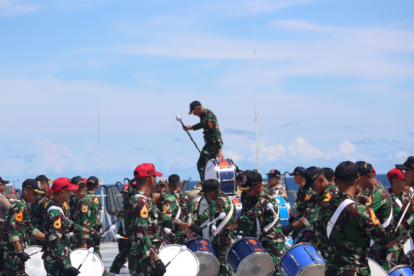 Kondisi lingkungan laut yang tidak berombak dan cuaca yang cenderung cerah selama lintas laut menuju Nusa Tenggara Barat dimanfaatkan oleh para peserta Latsitarda Nusantara XLII tahun 2022 untuk melaksanakan latihan Genderang Suling di geladak Heli KRI Banda Aceh-593.