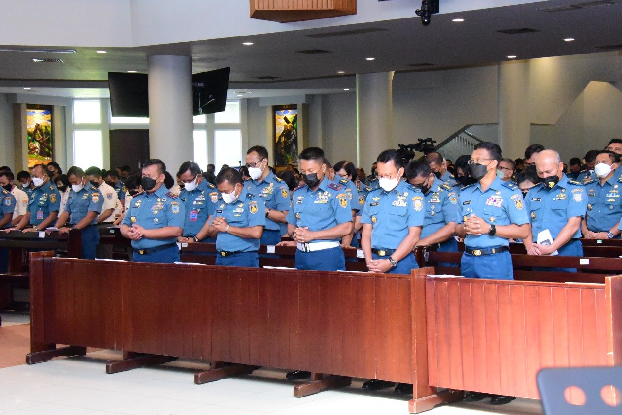 Umat Kristiani TNI AL menggelar perayaan Paskah Gabungan Wilayah Jakarta tahun 2022 yang diikuti oleh seluruh Satuan Kotama di wilayah Jakarta di Gereja Santo Yakobus, Sunter Kelapa Gading, Jakarta Utara. Rabu (18/5/2022).