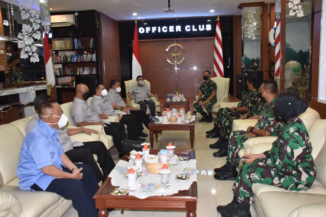 Panglima Komando Lintas Laut Militer Laksda TNI Erwin S. Aldedharma dengan penuh kehangatan menyambut dan menerima kunjungan kerja Ketua Umum Persatuan Purnawirawan Angkatan Laut Laksamana TNI (Purn) Siwi Sukma Adji beserta pengurus PPAL di ruang Officer Club, Mako Kolinlamil, Tanjung Priok, Jakarta Utara, Senin (23/5/2022).