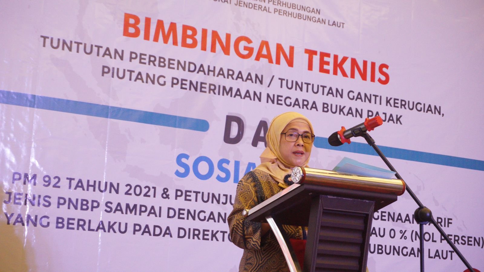Sekretaris Direktorat Jenderal Perhubungan Laut yang diwakili oleh Kepala Bagian Keuangan Retno Wijayanti saat pembukaan acara menyampaikan kegiatan Bimtek dan Sosialisasi ini sekaligus sebagai monitoring dan evaluasi Tuntutan Perbendaharan (TP)/Tuntutan Ganti Rugi (TGR), Piutang Penerimaan Negara Bukan Pajak (PNBP).
