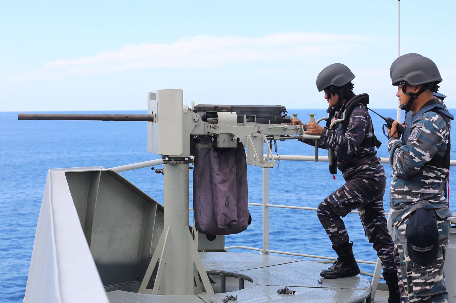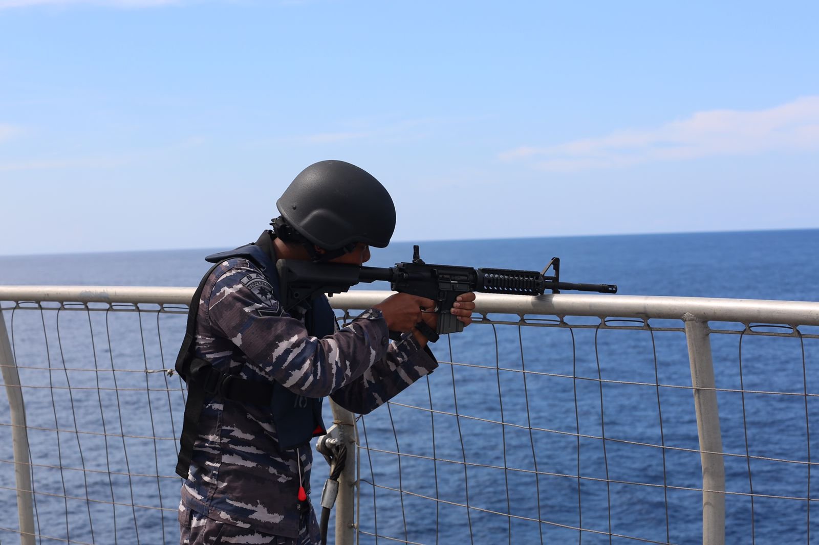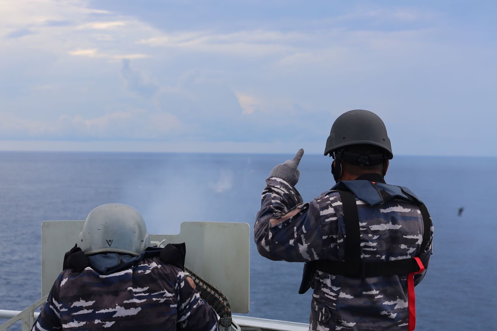 Dalam pelayarannya menuju Tarakan, prajurit KRI Banda Aceh-593 melaksanakan latihan menembak dengan menggunakan senjata KRI maupun senjata organik perorangan laras panjang di perairan Laut Sulawesi beberapa waktu yang lalu.