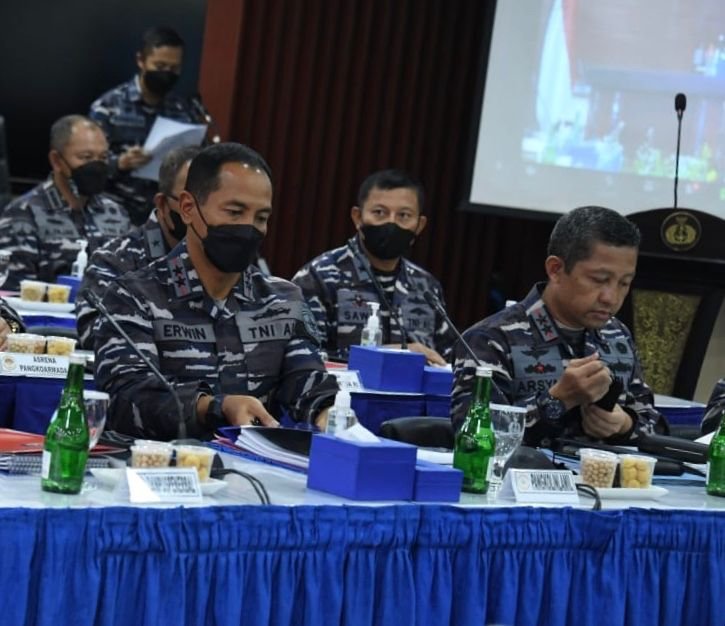 Panglima Komando Lintas Laut Militer Laksda TNI Erwin S. Aldedharma mengikuti paparan Konsep Rencana Operasi Trisila dan paparan Rencana Garis Besar Latihan Operasi Laut serta Rencana Penembakan Senjata Strategis TNI Angkatan Laut tahun 2022 yang dilaksanakan di Lounge Macan Kumbang, Mako Koarmada I, Jakarta Pusat, Kamis (2/6/2022).