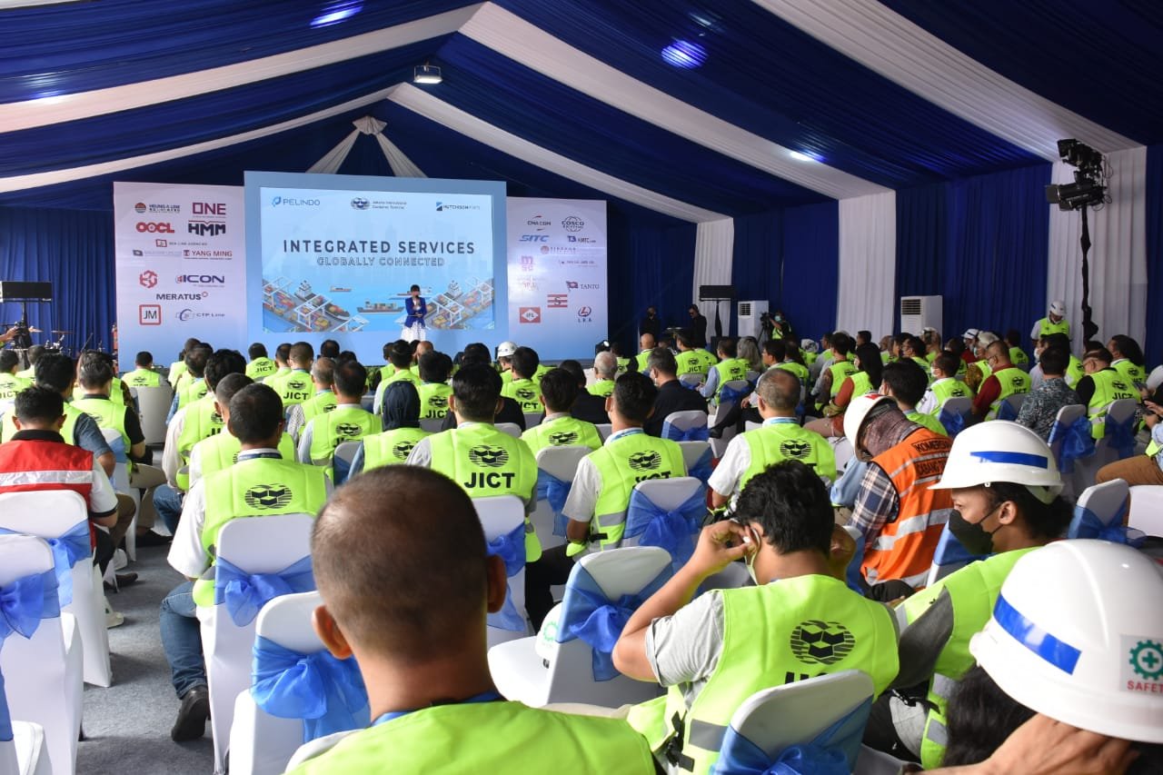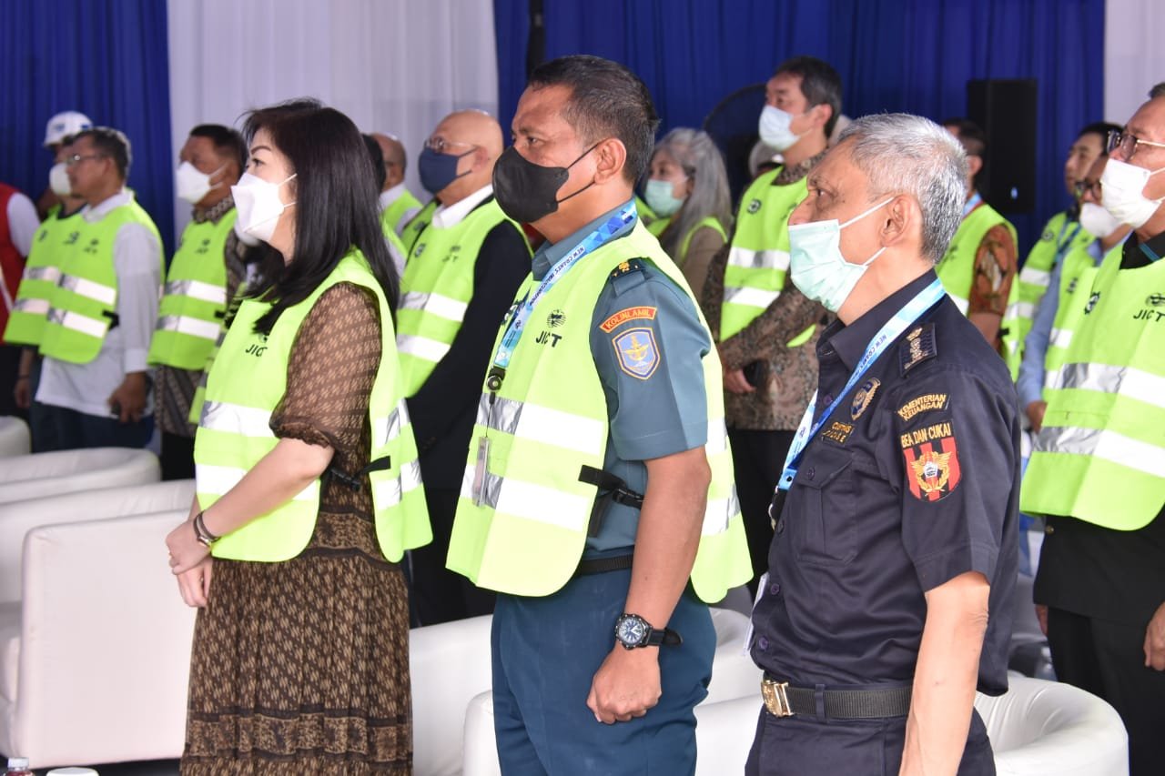 Fasilitas bongkar muat peti kemas terbaru jenis Quay Crane Super Post Panamax secara resmi dioperasikan di Jakarta International Container Terminal (JICT), Jakarta Utara. Pengoperasian ke dua unit Quay Crane itu ditandai dengan Inauguration of JICT New Cranes 2022 di dermaga Utara JICT, Tanjung Priok, Jakarta Utara yang turut dihadiri oleh Asisten Potensi Maritim Pangkolinlamil Kolonel Laut (P) Ketut Budiantara mewakili Panglima Komando Lintas Laut Militer Laksda TNI Erwin S. Aldedharma, Rabu (22/6/2022).