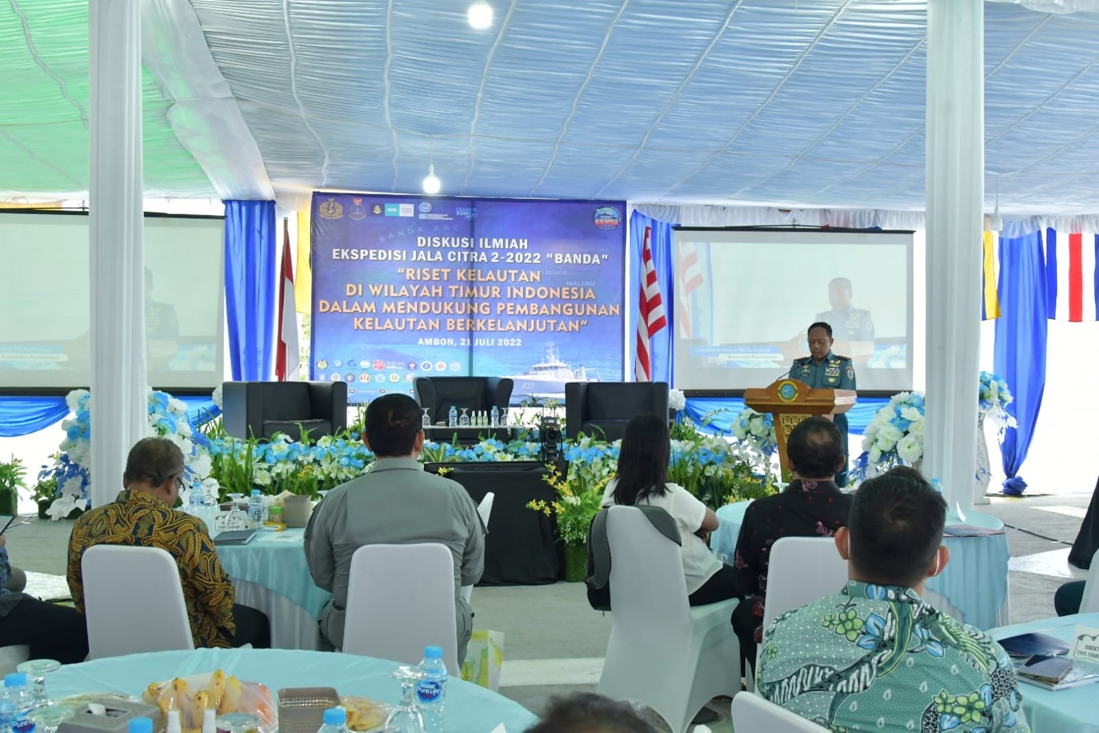 Diskusi ilmiah dengan tema “Riset Kelautan di Wilayah Timur Indonesia dalam mendukung Pembangunan Kelautan Berkelanjutan” tersebut dibuka oleh Komandan Pushidrosal (Danpushidrosal) Laksamana Madya TNI Nurhidayat, dengan menghadirkan para pemapar dari peneliti yang terlibat dalam Ekspedisi Jala Citra II – 2022 “Banda”, yaitu Kapten Laut (P) Affan Fadhilah, ST, M.Sc, Peneliti dari Pushidrosal (Chief Scientist Etape 1), Triyono, M.T, Peneliti Pusat Riset Kelautan, BRSDM, Kementerian Kelautan dan Perikanan (Chief Scientist Banda Naira), Dr. Luli Gustiantini, Peneliti Balai Besar Survei dan Pemetaan Geologi Kelautan, Kementerian ESDM, Kapten Laut (KH) I Wayan Sumardana, M.Si, Peneliti Pushidrosal (Chief Scientist Etape 2), serta Ir. Irma Kesaulya, M.Sc Ph.D Peneliti Universitas Pattimura.
