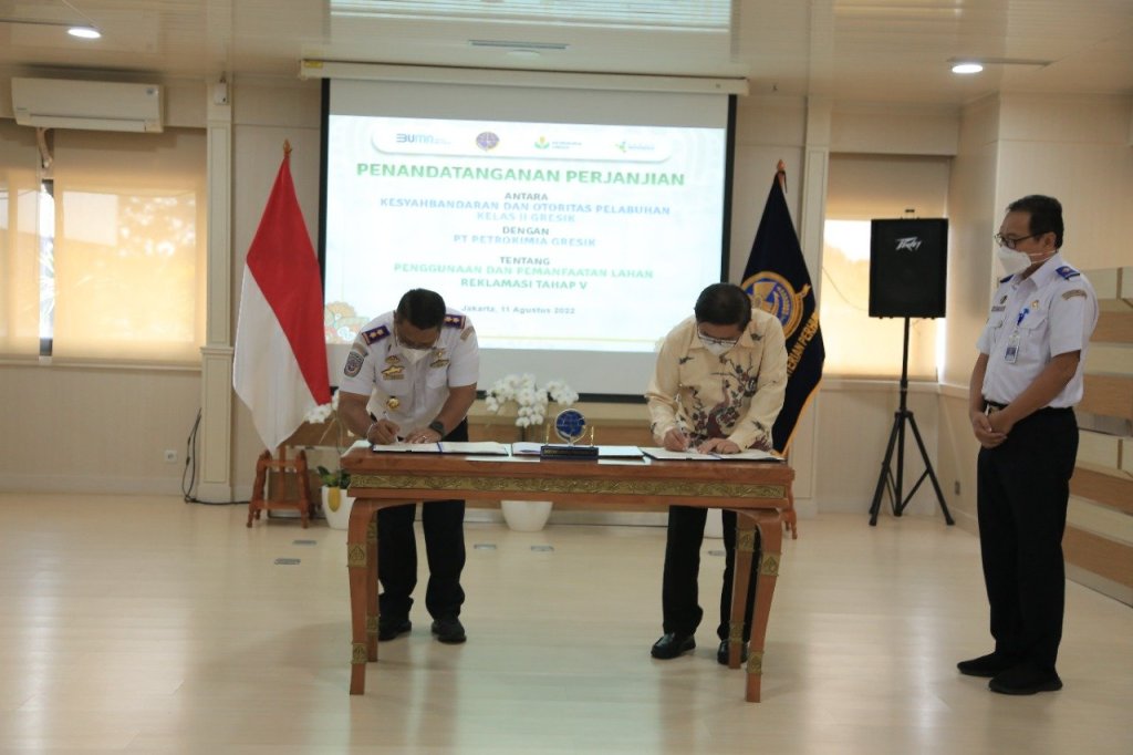 Penandatanganan tersebut dilakukan oleh Kepala Kantor Kesyahbandaran dan Otoritas Pelabuhan Kelas II Gresik Capt Roni Fahmi dengan PT. Petrokimia Gresik, Dwi Satriyo Annurogo bertempat di Ruang Sriwijaya, Kantor Pusat Direktorat Jenderal Perhubungan Laut, Kementerian Perhubungan, Jakarta, Kamis (11/8/2022).