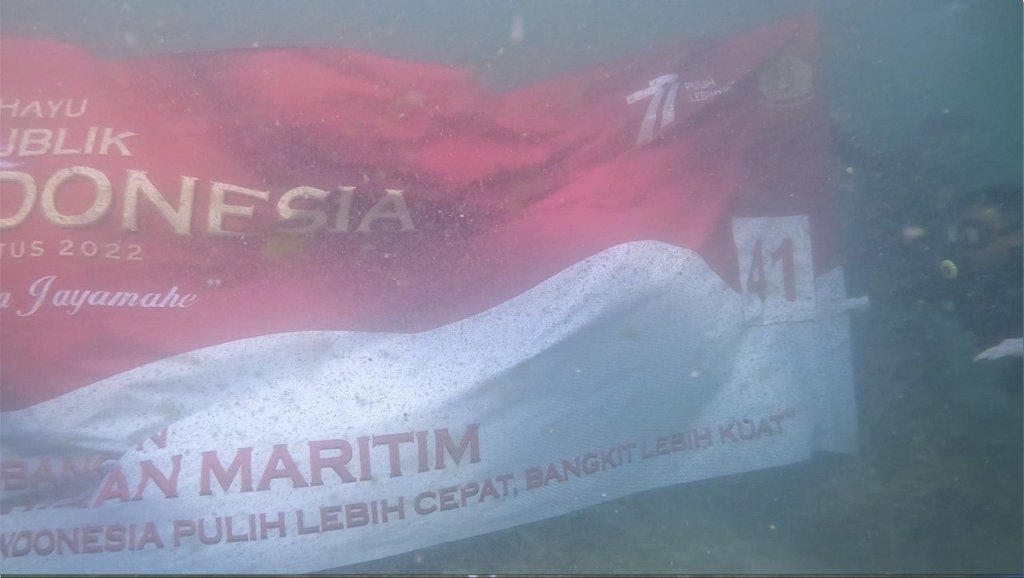Dalam rangka memperingati Hari Kemerdekaan Republik Indonesia ke-77, Pusat Hidro-Oseanografi TNI AL (Pushidrosal) mengibarkan Bendera Merah Putih di dasar laut perairan Pulau Damar, Kepulauan Seribu, Rabu (17/8/2022).