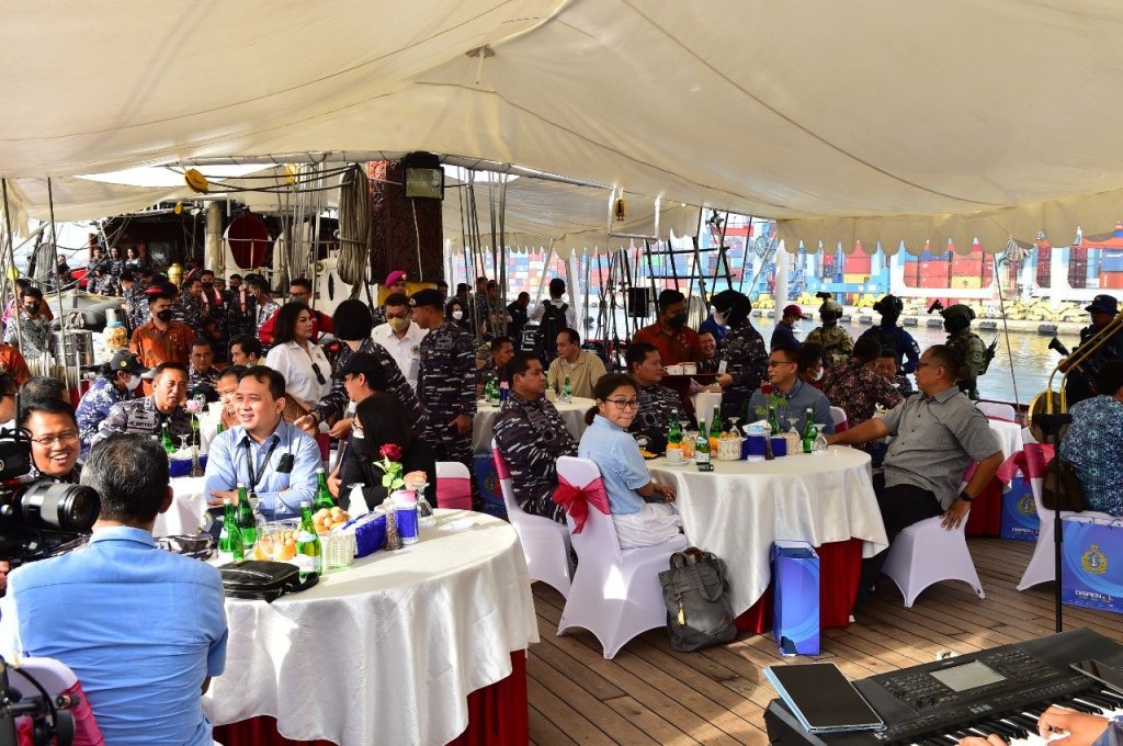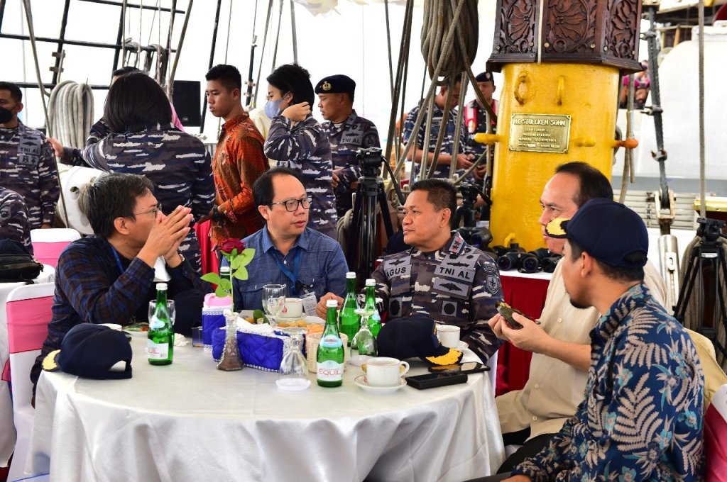 Kepala Staf Angkatan Laut (Kasal) Laksamana TNI Yudo Margono bersilaturahmi dan minum kopi bersama dengan para pemimpin media nasional di atas KRI Dewaruci sambil berlayar (joy sailing) ke Perairan Teluk Jakarta. Jumat (2/9/2022). Turut hadir dalam kegiatan tersebut Panglima Komando Lintas Laut Militer Laksda TNI Agus Hariadi.