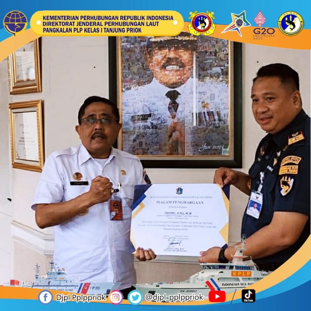 Kementerian Perhubungan Cq Direktorat Jenderal Perhubungan Laut, Direktorat KPLP melalui Kepala Pangkalan PLP Kelas I menerima piagam penghargaan dan cendramata dari Pemerintah Daerah Kabupaten Administrasi Kepulauan Seribu Provinsi DKI Jakarta, Rabu (21/9/2022).