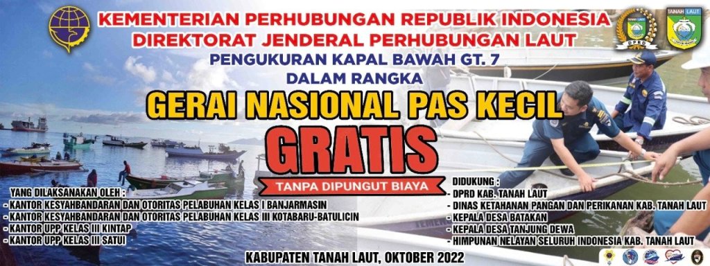 Kementerian Perhubungan Cq Direktorat Jenderal Perhubungan Laut melalui Kantor Kesyahbadaran dan Otoritas Pelabuhan ( KSOP) Kelas I Banjarmasin dan UPT Direktorat Jenderal Perhubungan Laut (DPJL) menyelenggarakan Gerai Nasional Pas Kecil Gratis Tahun 2022 di wilayah Kalimantan Selatan.