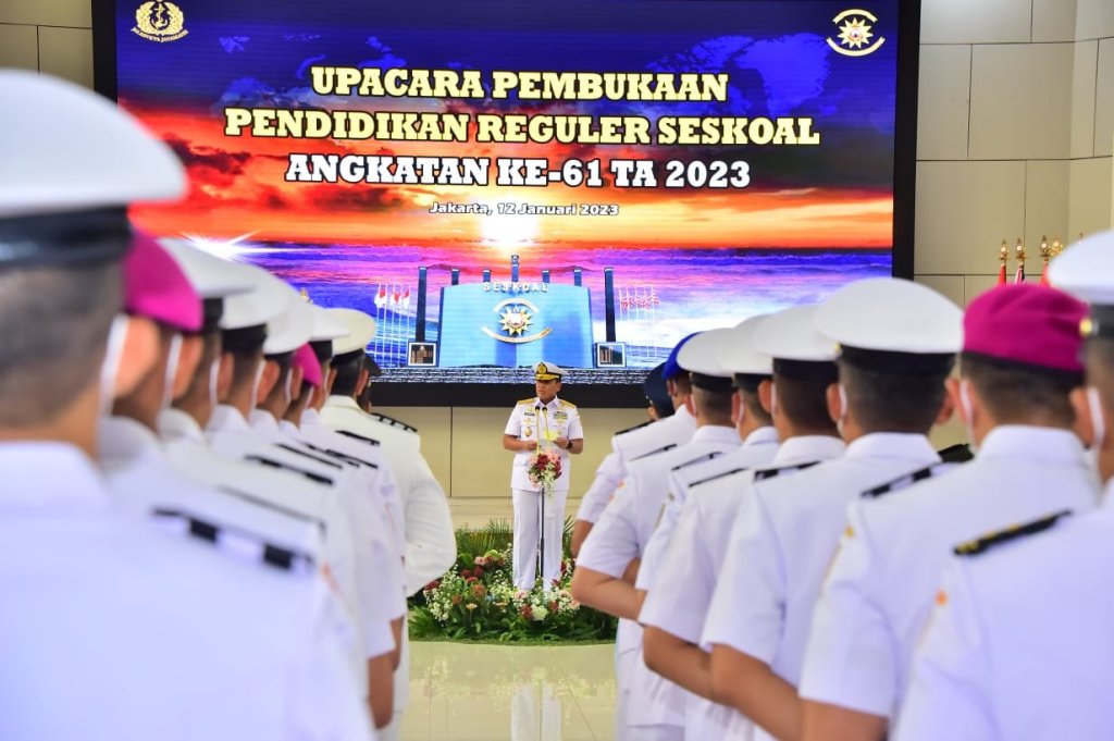 Kepala Staf Angkatan Laut Laksamana TNI Muhammad Ali memimpin Upacara Pembukaan Pendidikan Reguler (Dikreg) Sekolah Staf dan Komando TNI Angkatan Laut (Seskoal) Angkatan ke-61 tahun 2023 di Auditorium Yos Soedarso, Seskoal, Cipulir, Jakarta Selatan, Kamis (12/1/2023).