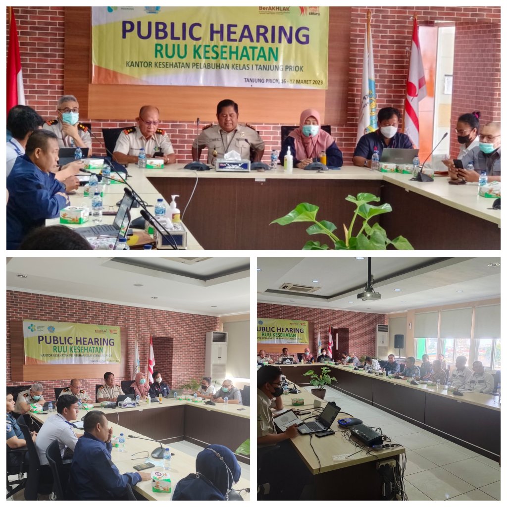 Kementerian Kesehatan Cq Direktorat Jenderal Pencegahan dan Pengendalian Penyakit (P2P) melalui Kantor Kesehatan Pelabuhan ( KKP) Kelas I Tanjung Priok menyelenggarakan Rapat Dengar Pendapat (Public Hearing) secara hybrid, luring terkait RUU Kesehatan yang substansinya terkait Wabah Penyakit Menular, bertempat di Ruang Rapat Onrust KKP Kelas I Tanjung Priok, Kamis (16/3/2023).