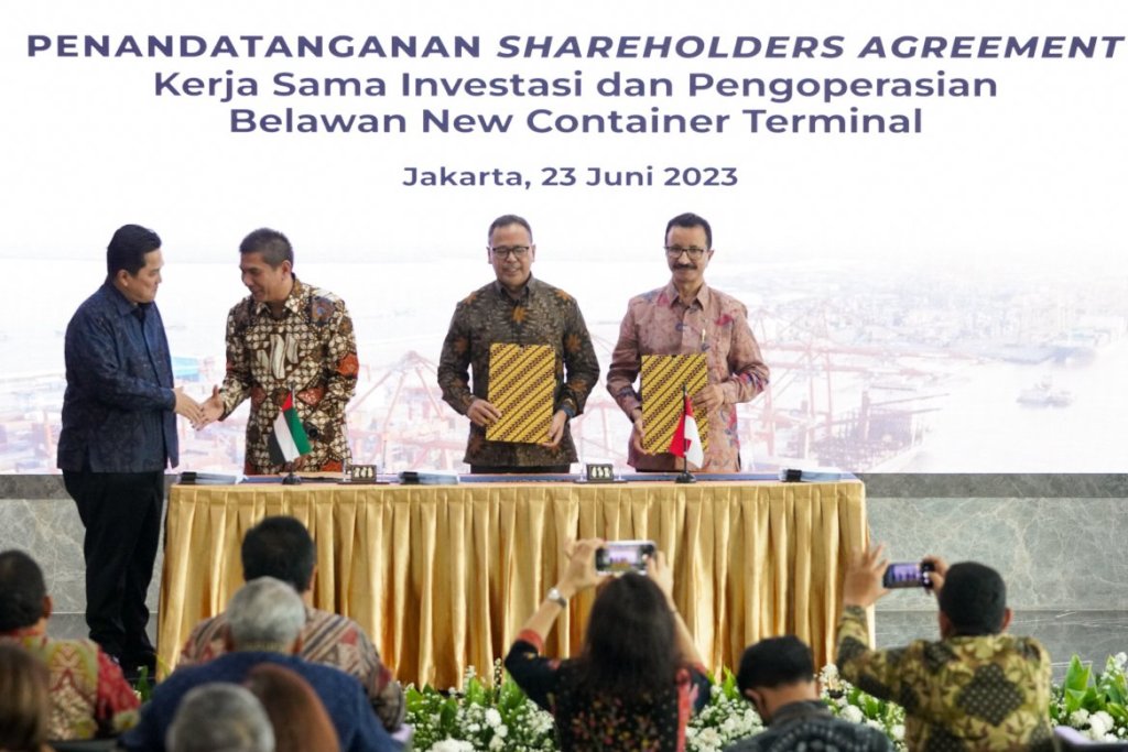 PT Pelabuhan Indonesia (Persero) (Pelindo) melalui cucu usahanya, PT Prima Terminal Petikemas (Prima TPK), dan konsorsium yang dibentuk oleh Indonesia Investment Authority (INA) bersama dengan DP World FZE (DP World), yaitu PT INA DPWorld Investment (INA DPWorld), di Jakarta Jumat (23/6/2023). Melaksanakan Penandatanganan Perjanjian Pemegang Saham (Shareholders Agreement/SHA) untuk pendirian Perusahaan Patungan yang akan melakukan pengembangan pasar dan pengoperasian Belawan New Container Terminal (BNCT), dalam rangka memperkuat infrastruktur pelabuhan Indonesia.