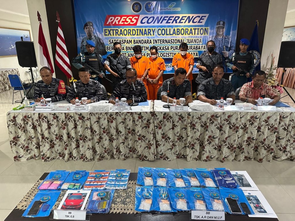 Dalam kesempatan ini, Komandan Pangkalan Udara TNI AL (Danlanudal) Juanda, Kolonel Laut (P) Heru Prasetyo, menyampaikan bahwa pengamanan tersangka ini bermula dari penemuan barang bukti narkotika jenis sabu-sabu seberat 519 gram di Regulated Agent Angkasa Pura 1 Logistics Kargo Terminal 1 Bandara Internasional Juanda pada tanggal 21 September 2023 oleh Satgaspam Bandara Juanda, Avsec Angkasa Pura I dan personel dari Angkasa Pura Logistic.