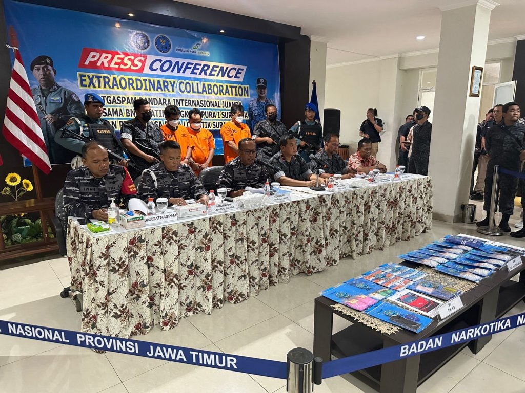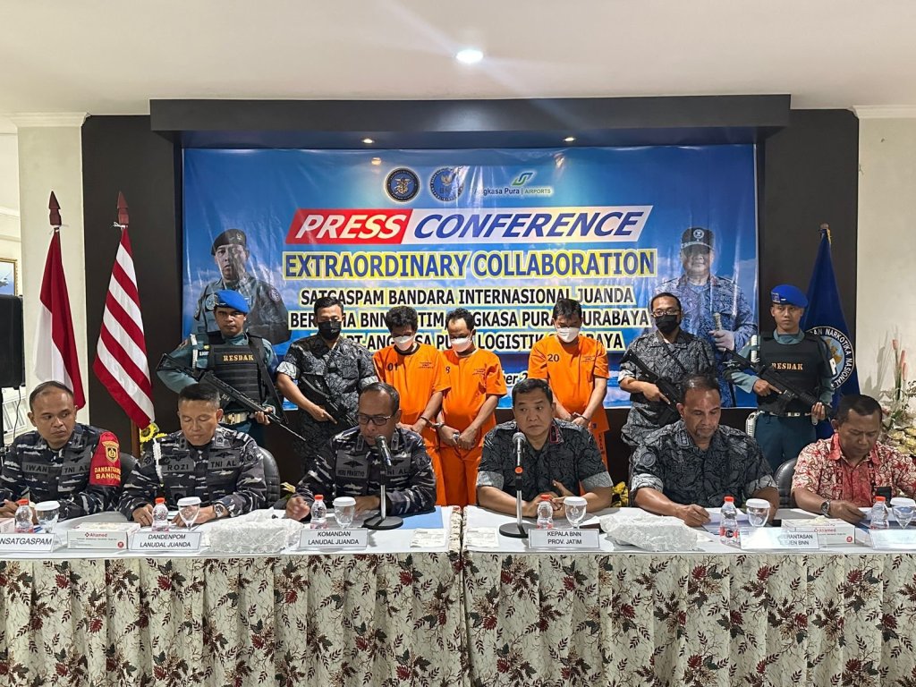 TNI Angkatan Laut (TNI AL) dalam hal ini Satgaspam Bandara Internasional Juanda bekerjasama dengan Badan Narkotika Nasional Provinsi (BNNP) Jawa Timur dan Angkasa Pura I Surabaya menyelenggarakan konferensi pers “Extraordinary Collaboration”, Jumat (29/9/2023). Dalam rangka mengungkap penggagalan upaya pengiriman narkotika jenis sabu-sabu (methaphetamine) melalui kargo terminal 1 Bandara Internasional Juanda yang terjadi Kamis tanggal 21 September lalu.