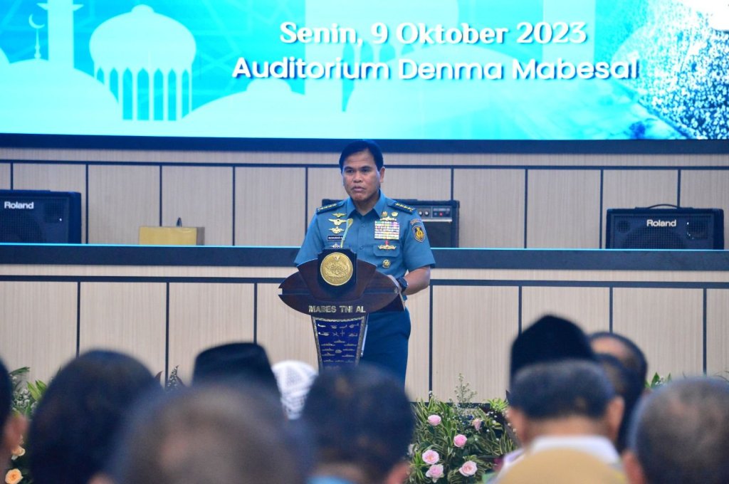 Panglima Komando Lintas Laut Militer Laksda TNI Edwin, S.H., M.Han., M.H. menghadiri peringatan Maulid Nabi Muhammad SAW dan pelepasan peserta ibadah umrah dinas tahun 2023 yang dipimpin oleh Kepala Staf Angkatan Laut Laksamana TNI Muhammad Ali di Auditorium Denma Mabesal, Cilangkap, Jakarta Timur, Senin (9/10/2023).