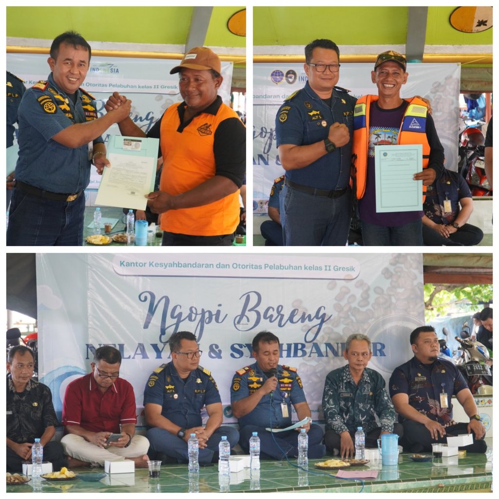 Selain penerbitan E-Pas Kecil, pada kesempatan itu Kepala KSOP Kelas II Gresik Hotman Siagian didampingi Kasie SHSK Alit Sudarsono memberikan alat keselamatan berlayar berupa life jacket gratis dan bingkisan secara simbolis kepada nelayan yang hadir.