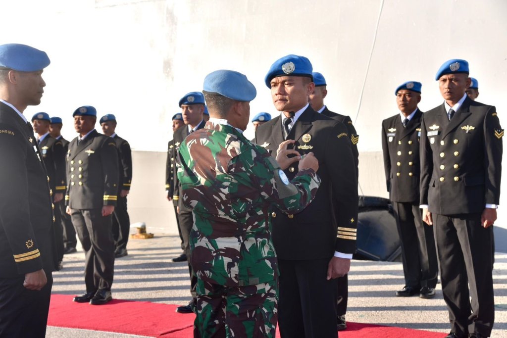 MTF Commander, Rear Admiral Dirk Gartner (Jerman) selaku Inspektur Upacara Medal Parade menyematkan langsung UN Medal kepada Dansatgas, Pilot 1, Serka BEK Andi Ardianto sebagai Bintara Teladan, dan KLS ETA Diki Bagus sebagai Tamtama Teladan.