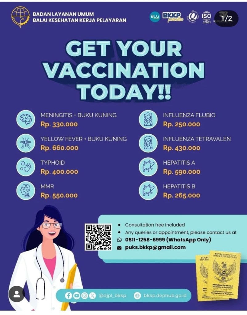 Balai Kesehatan Kerja Pelayaran (BKKP) Tanjung Priok Jakarta Utara salah satu Unit Pelaksana Teknis (UPT) di lingkungan Direktorat Jenderal Perhubungan Laut saat ini sebagai Badan Layanan Umum (BLU) tidak lagi hanya memberikan pelayanan kesehatan kepada para pelaut tetapi juga sudah memberikan pelayanan vaksinasi kepada masyarakat, termasuk vaksinasi haji dan umroh bersertifikat internasional.